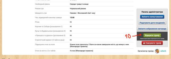 Гравець, що створює турнір, відповідальний за коректні налаштування (15 хв на гравця).
